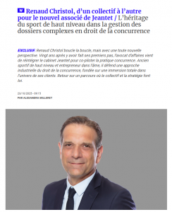 Nommé associé chez Jeantet en septembre, Renaud Christol revient sur son parcours et sa vision du droit de la concurrence dans un portrait publié par Wansquare : « Renaud Christol boucle la boucle, mais avec une toute nouvelle perspective. Vingt ans après y avoir fait ses premiers pas, l’avocat d’affaires vient de réintégrer le cabinet Jeantet […]