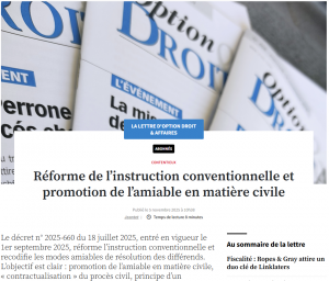Le décret n°2025-660 du 18 juillet 2025, entré en vigueur le 1er septembre 2025, réforme l’instruction conventionnelle et recodifie les modes amiables de résolution des différends. L’objectif est clair: promotion de l’amiable en matière civile, « contractualisation » du procès civil, principe d’un règlement amiable de l’instruction. Lire l’article : ici