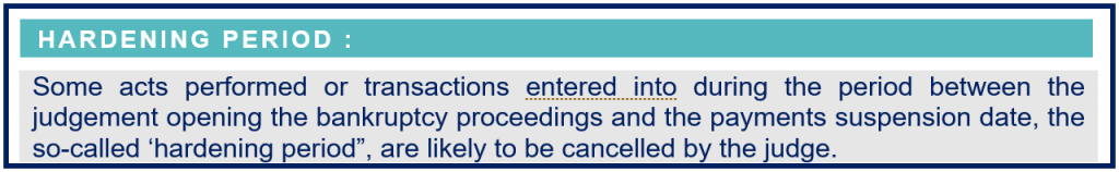 - Hardening period by the application of the provisions of indents 2°, 3° and 4° of article L. 631-8 of the French commercial code: the court may carry back the payments suspension date to a date prior to the judgement opening the bankruptcy proceedings. Thus, the payments suspension date could be carried back to a date that would be prior to 12 March 2020, i.e. the beginning of the Protected Period.